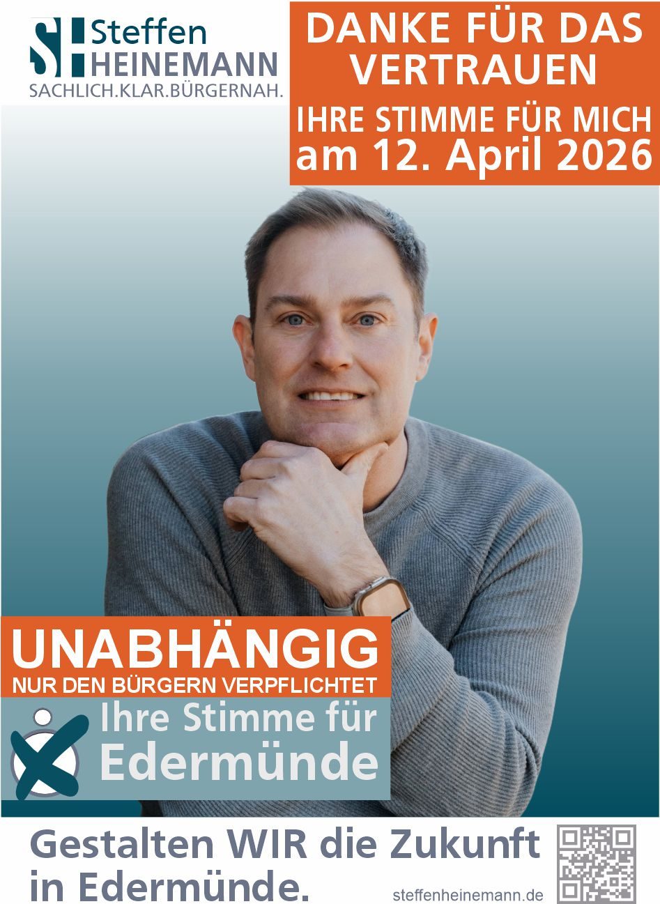 Hier präsentiere ich mich und mein Wahlprogramm als unabhängiger und parteiloser Bürgermeisterkandidat für Edermünde. Mein Ziel ist es, unsere Gemeinde aktiv zu gestalten und zukunftsfähige Lösungen für die Herausforderungen vor Ort zu entwickeln. SACHLICH.KLAR.BÜRGERNAH.